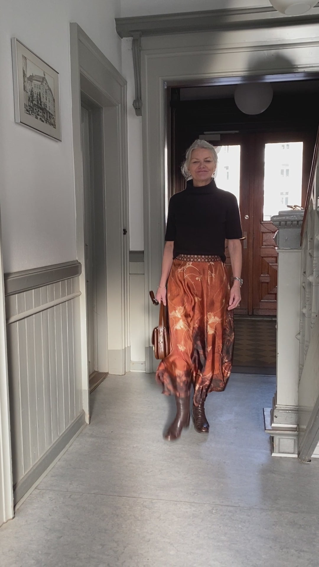 En lang, flydende silkenederdel fra det italienske mærke Pierre-Louis Mascia i varme rust- og jordtoner med en naturinspireret print af bl.a. små, delikate sommerfugle og vilde landskaber.